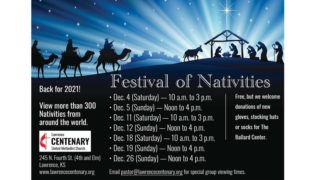 In the episode, Todd mentions the Festival of Nativities at Centenary United Methodist Church in Lawrence, Kansas. The hours and location of the festival are in the image below.